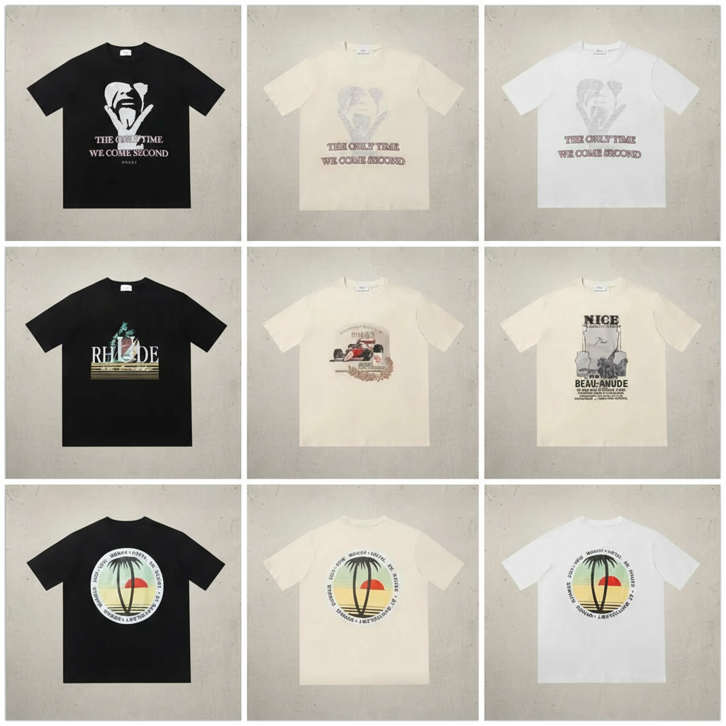 Rhude T-Shirts featuring unique graphic prints, premium cotton fabric, and streetwear style, perfect for casual outfits and fashion lovers seeking comfort and trend.