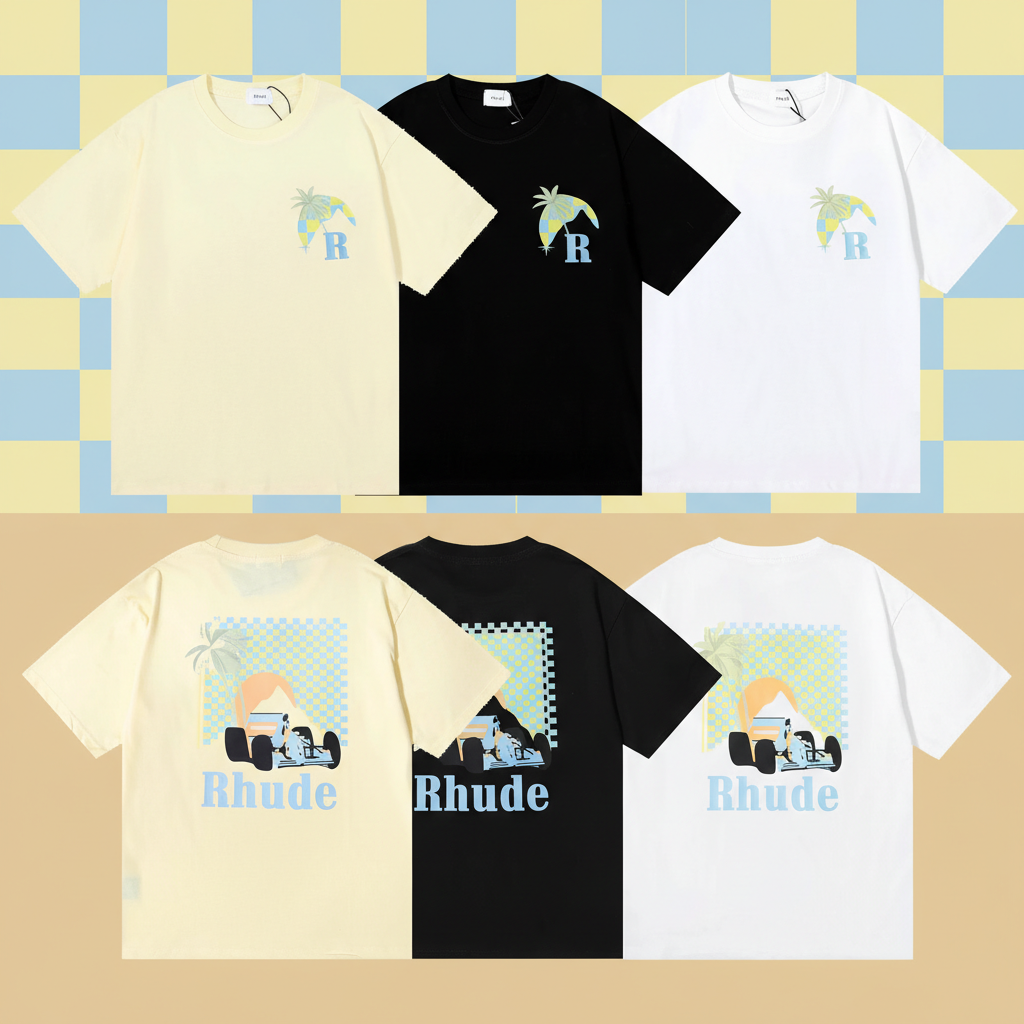 Rhude T-Shirt with tropical palm and race car graphic, casual short sleeve streetwear top for men and women, summer fashion style in multiple colors.