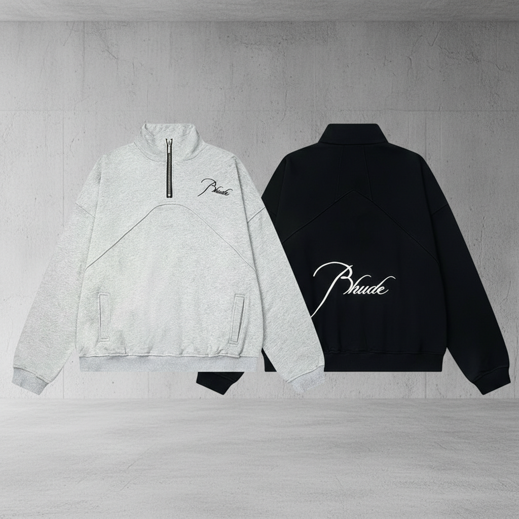 Rhude half-zip hoodies for men, stylish streetwear design, premium cotton, available in grey and black, perfect for casual wear and layering in all seasons.