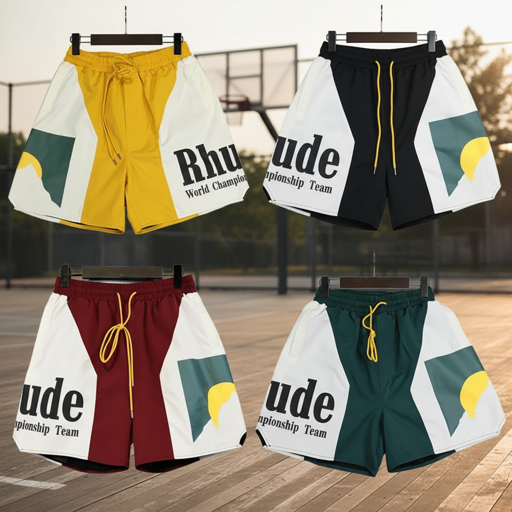 Rhude Men’s Colorblock Shorts – Stylish Summer Beachwear with Drawstring Waist, Lightweight Fabric, and Bold Logo Design for Casual Streetwear and Sports Style.