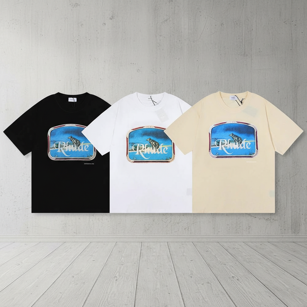 Rhude T-Shirt with vintage graphic print, premium cotton, casual streetwear style, available in black, white, and beige for versatile everyday fashion.