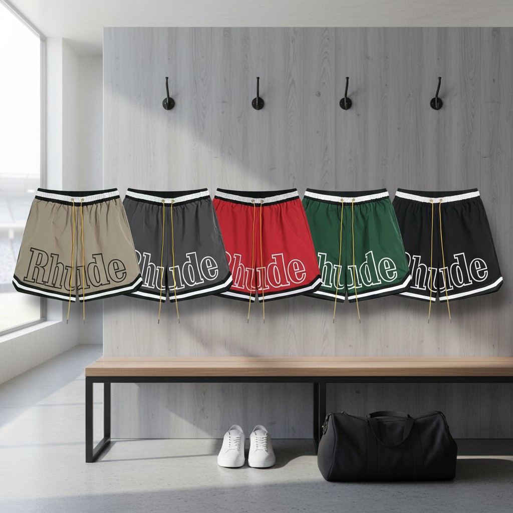 Rhude men’s casual athletic shorts, bold logo print, drawstring waist, breathable fabric, perfect for sports, streetwear, and summer fashion in multiple colors.