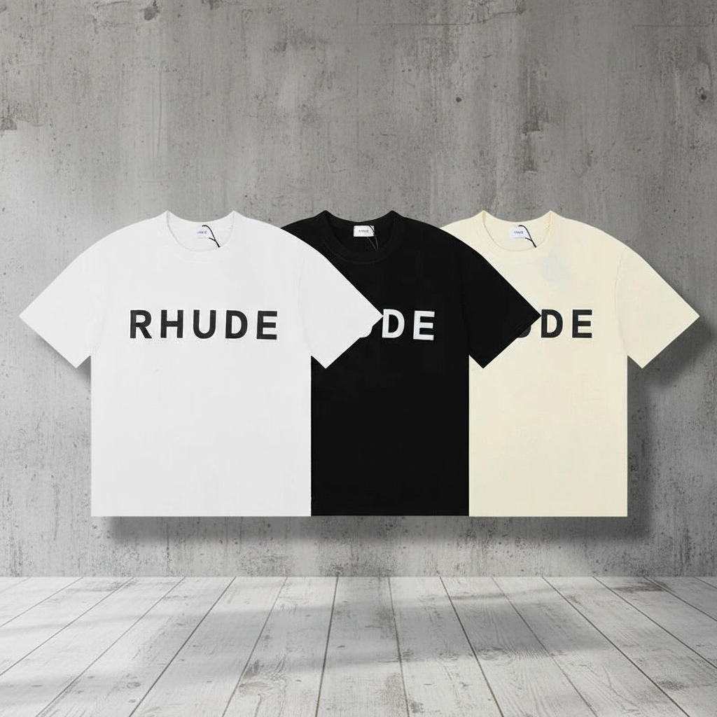 Rhude T-Shirt Collection, premium cotton tees with bold logo print, available in black, white, and beige for stylish casual wear.
