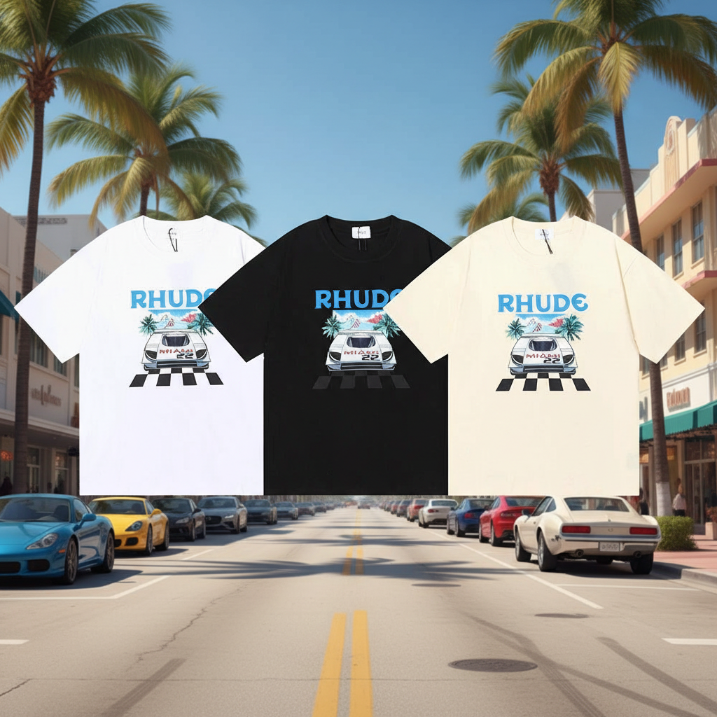 Rhude Miami Graphic T-Shirt, casual streetwear style with palm tree print, available in black, white, and beige, perfect for summer fashion and everyday wear.