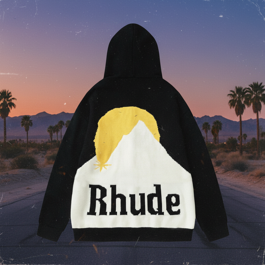 Rhude Mountain Graphic Hoodie, stylish black pullover with bold yellow and white design, premium streetwear for casual and trendy looks.