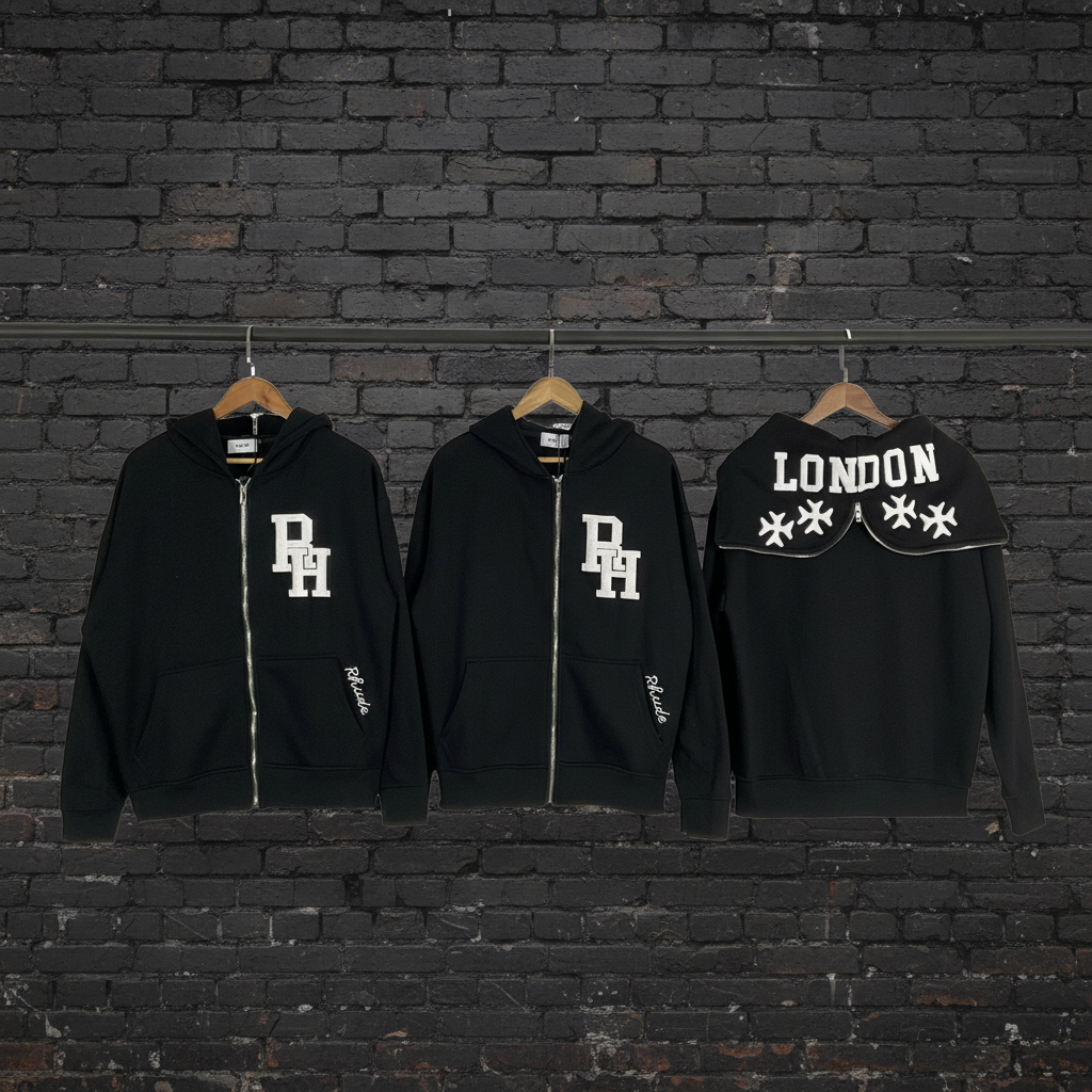Rhude Hoodies Black Zip-Up Sweatshirt with PH Logo and London Graphic, Stylish Streetwear for Men and Women