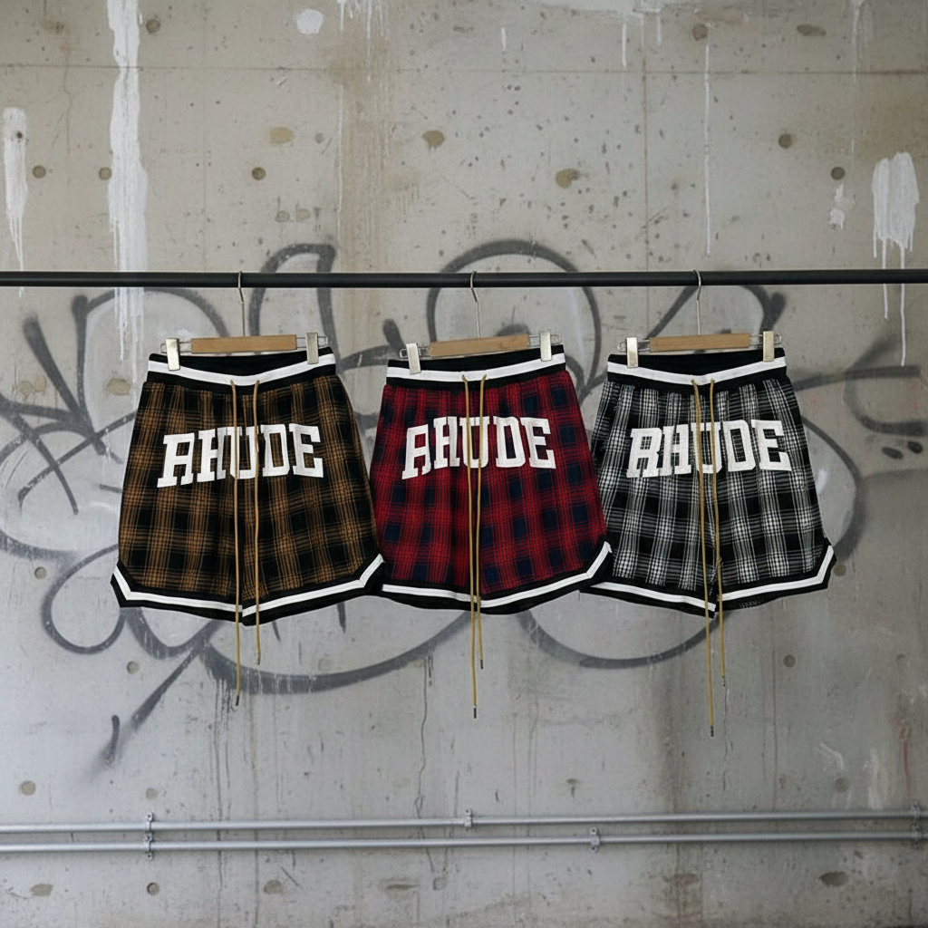 Rhude plaid casual shorts for men, stylish loose fit with bold logo, breathable fabric, perfect for streetwear and summer fashion.
