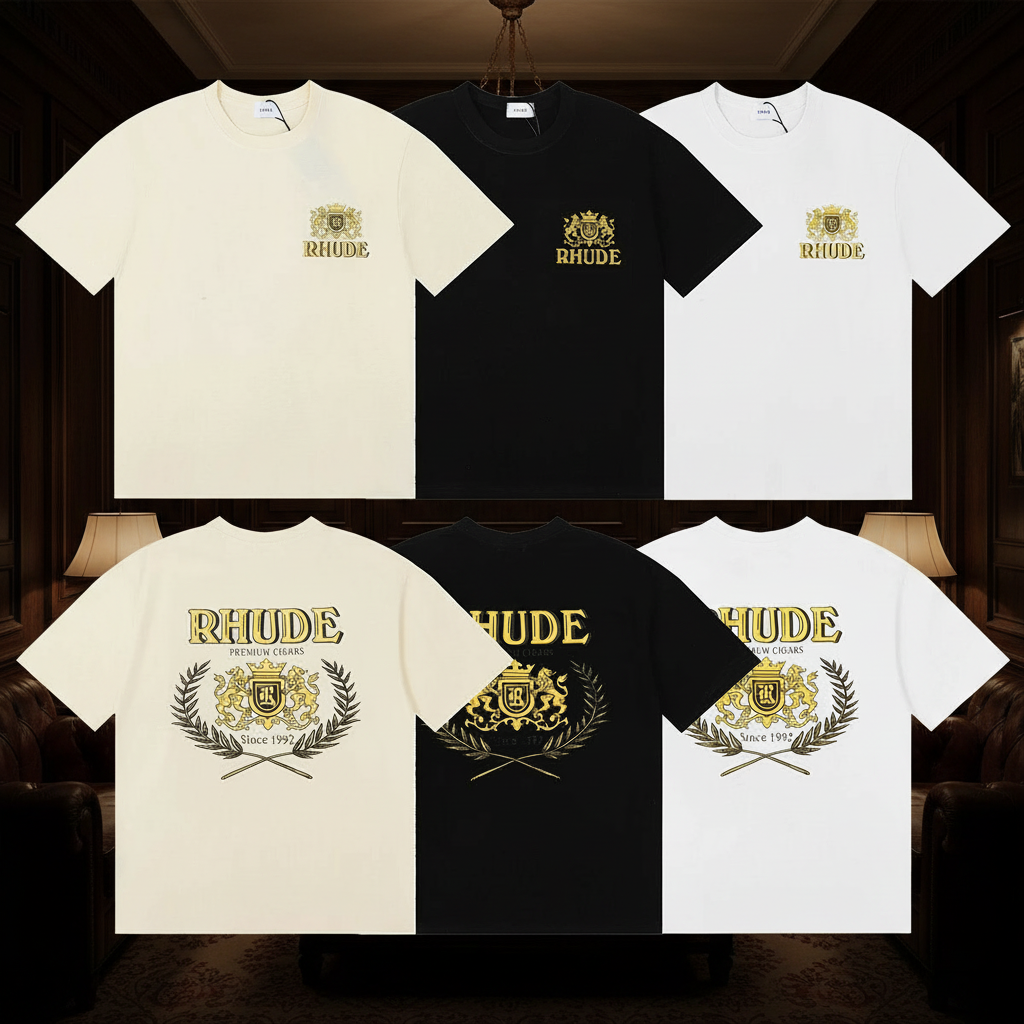 Rhude premium graphic T-shirt with crest logo, classic streetwear style, short sleeve cotton top for casual and urban fashion.