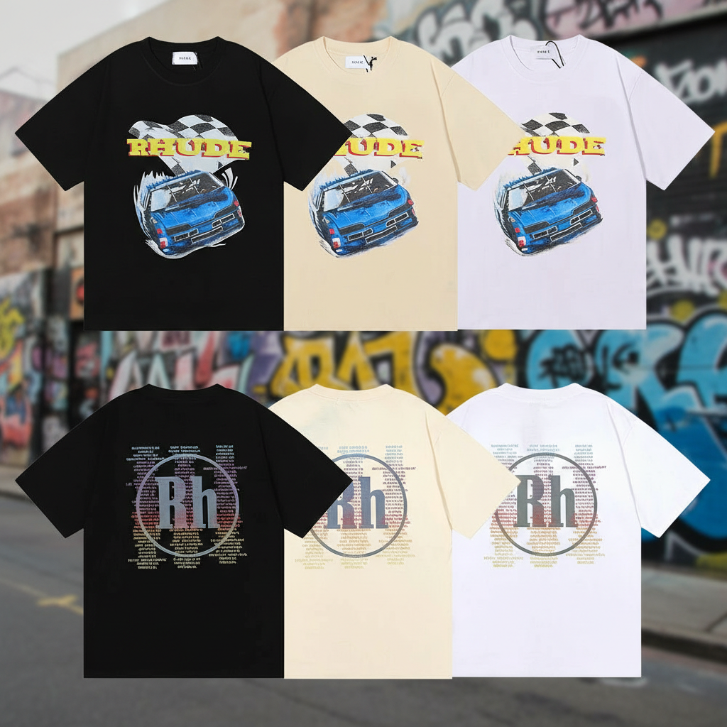 Rhude T-Shirt with race car graphic and checkered flag, casual streetwear style, short sleeve, soft cotton, perfect for motorsport fans and urban fashion.