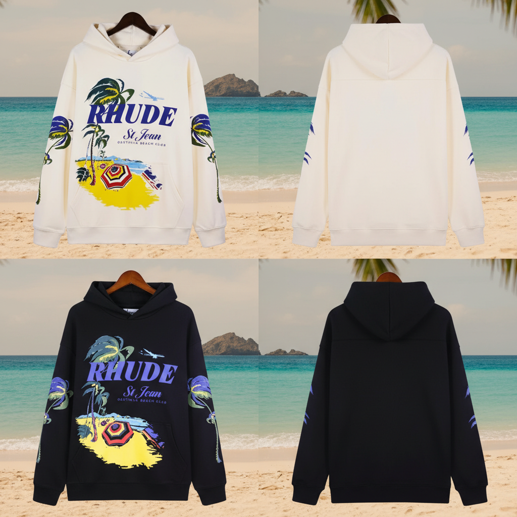 Rhude Hoodie featuring tropical beach print, soft cotton fabric, and relaxed fit. Stylish streetwear for casual outings and vacation vibes.