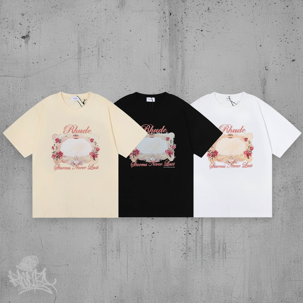 Rhude graphic T-shirt with “Storms Never Last” print, premium cotton, casual streetwear style, available in black, white, and beige for trendy everyday wear.