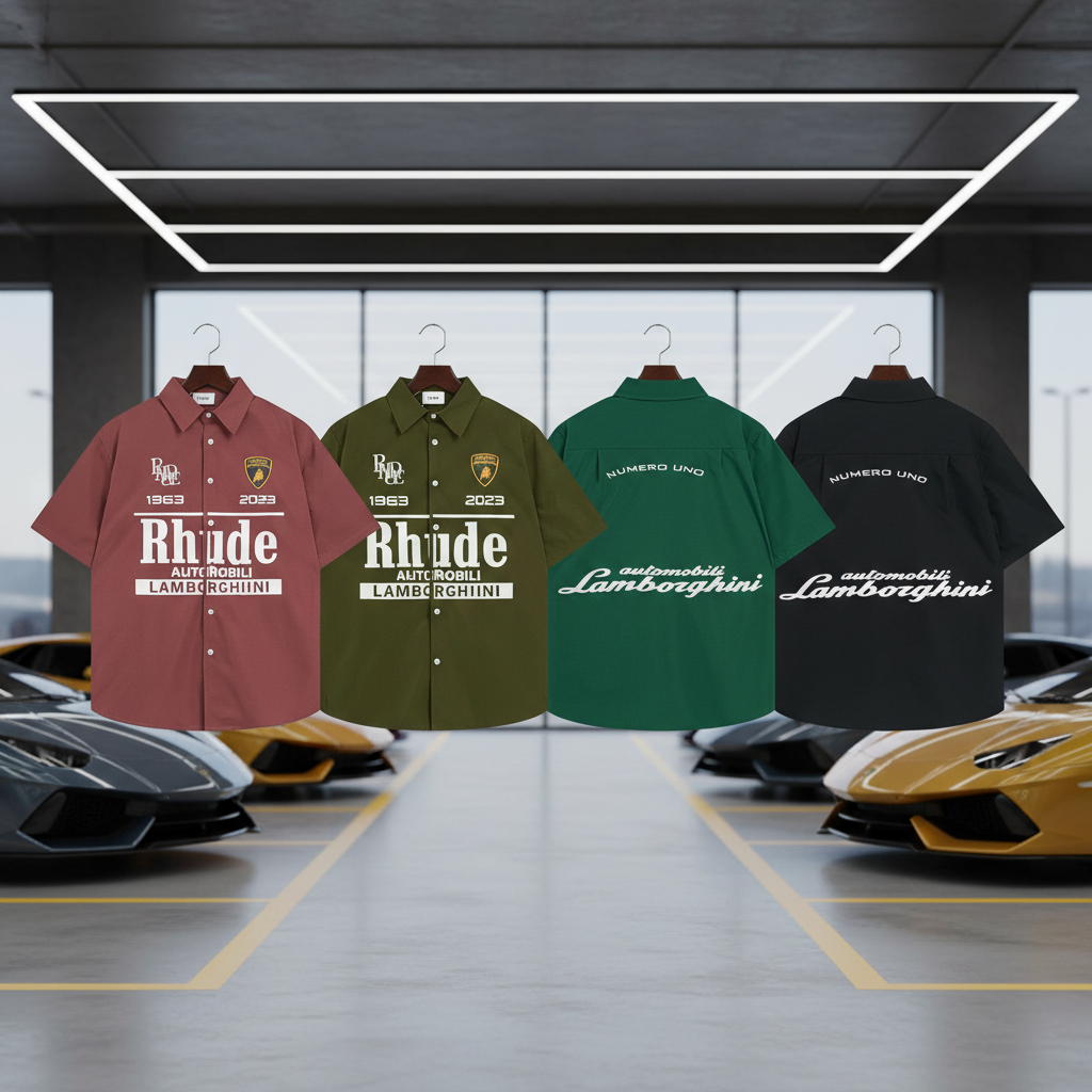 Rhude x Lamborghini short-sleeve shirts, stylish racing-inspired design, premium quality cotton, perfect for motorsport fans and streetwear fashion.
