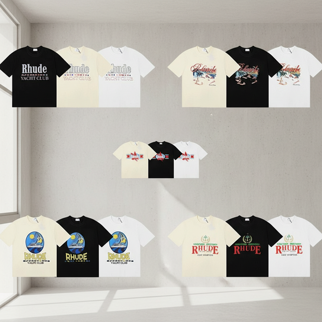 Rhude T-Shirts featuring stylish yacht club and graphic prints, premium cotton, perfect for casual wear and street fashion lovers worldwide.