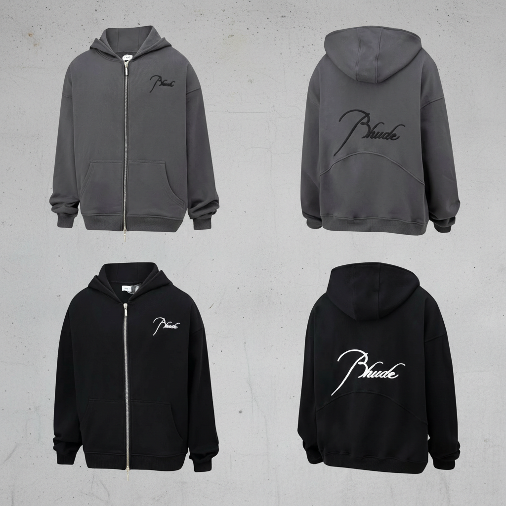 Rhude Hoodie, premium cotton zip-up sweatshirt with signature logo print, casual streetwear style, available in black or grey for men and women.