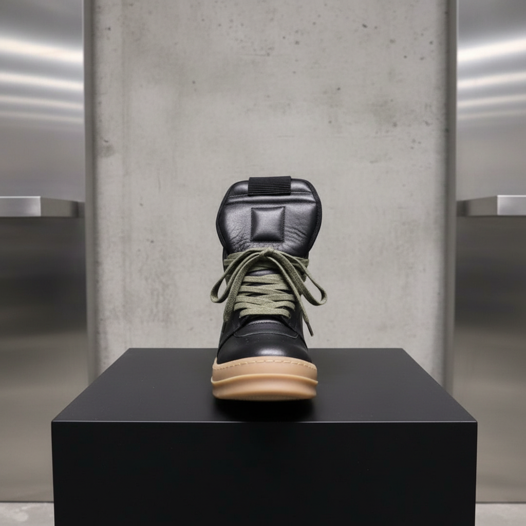 Rick Owens high-top leather sneakers with chunky gum sole, padded ankle, and oversized tongue, blending edgy design with ultimate comfort for streetwear style.