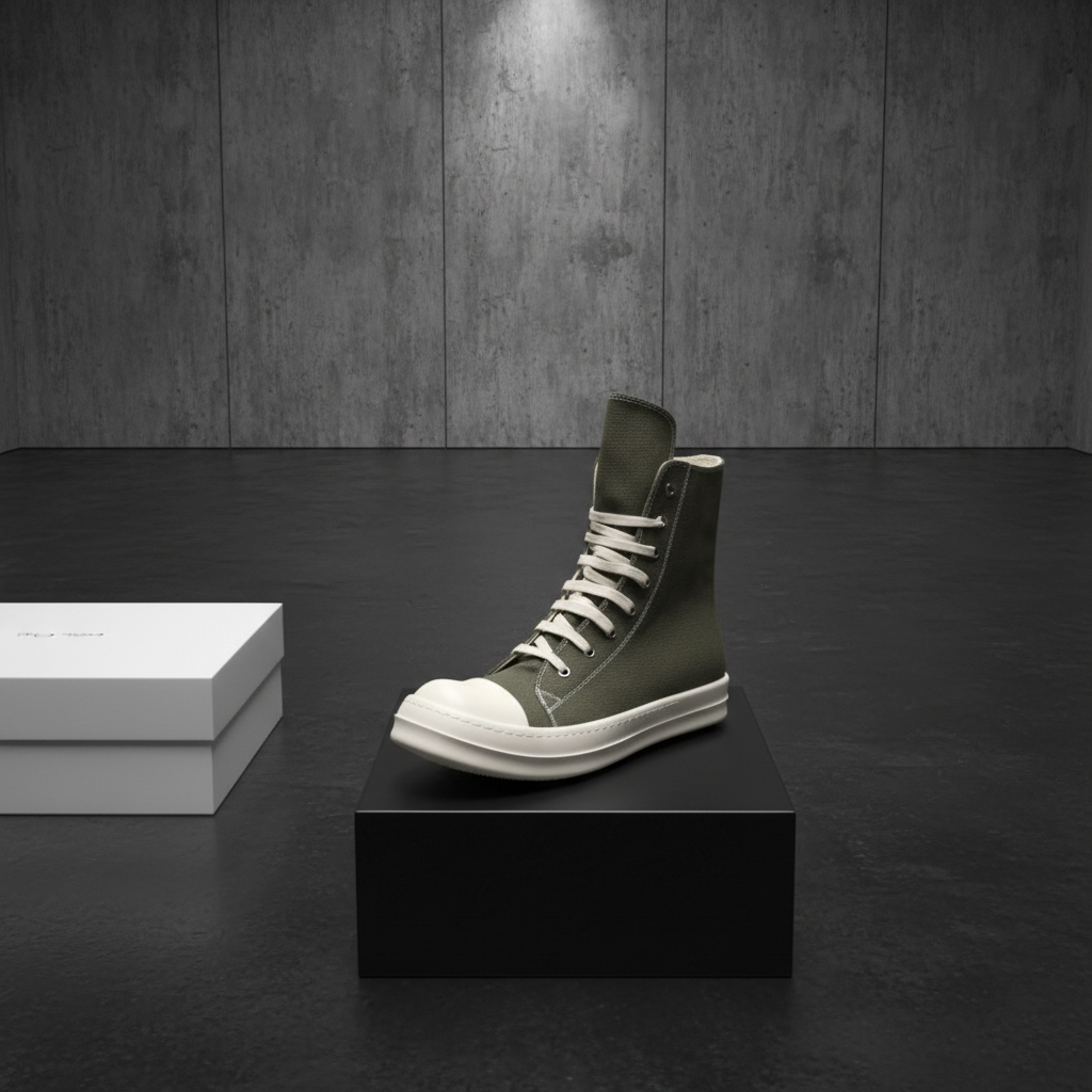 Rick Owens high-top canvas sneakers in olive green with white rubber sole and lace-up design, featuring minimalist luxury style perfect for streetwear and modern fashion lovers.