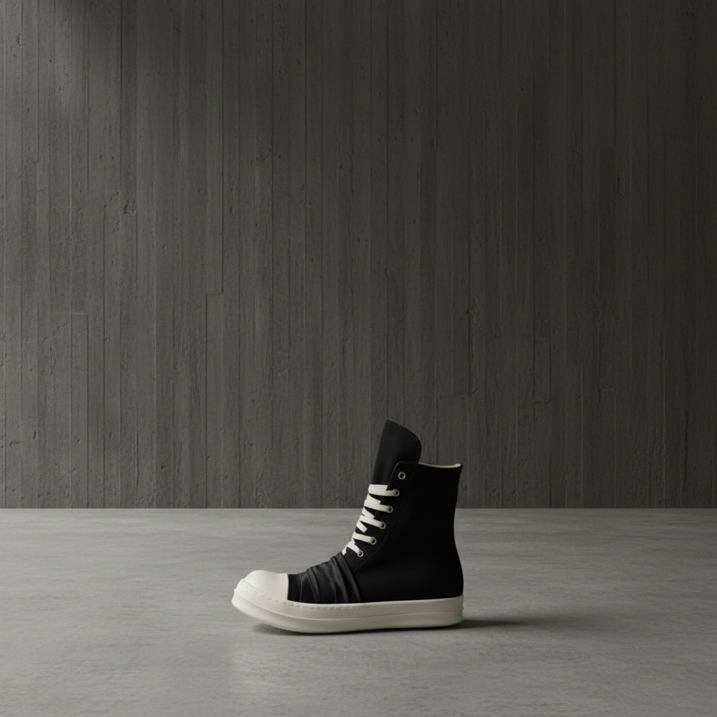 Rick Owens high-top sneakers with black canvas, white laces, and rubber toe cap, combining avant-garde style and comfort for urban fashion lovers.