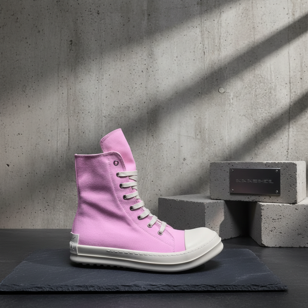 Rick Owens Pink High-Top Canvas Sneakers with White Rubber Sole, Stylish Lace-Up Design, Trendy Streetwear Footwear for Men and Women.