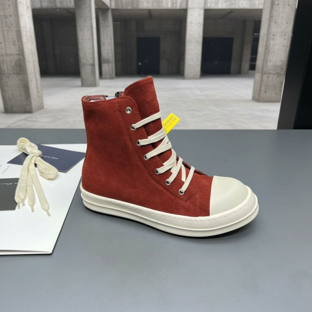 Rick Owens high-top sneakers in red suede with white rubber toe cap, lace-up design, and side zipper, combining edgy style with premium craftsmanship for streetwear fashion.