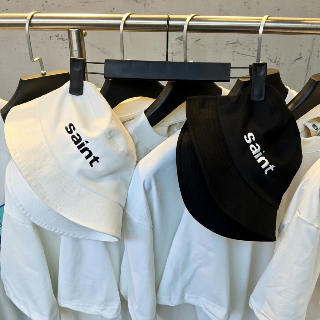 HatsSaint bucket hat, stylish black and white design, breathable cotton, perfect for streetwear, travel, and outdoor activities.