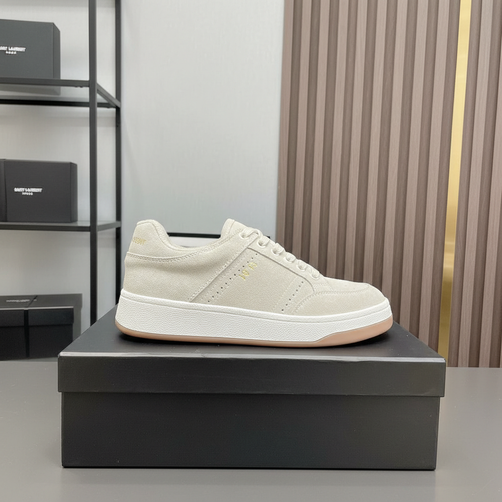 Saint Laurent beige suede low-top sneakers with gold logo detail, stylish design, and comfortable rubber sole, perfect for casual and fashion-forward wear.