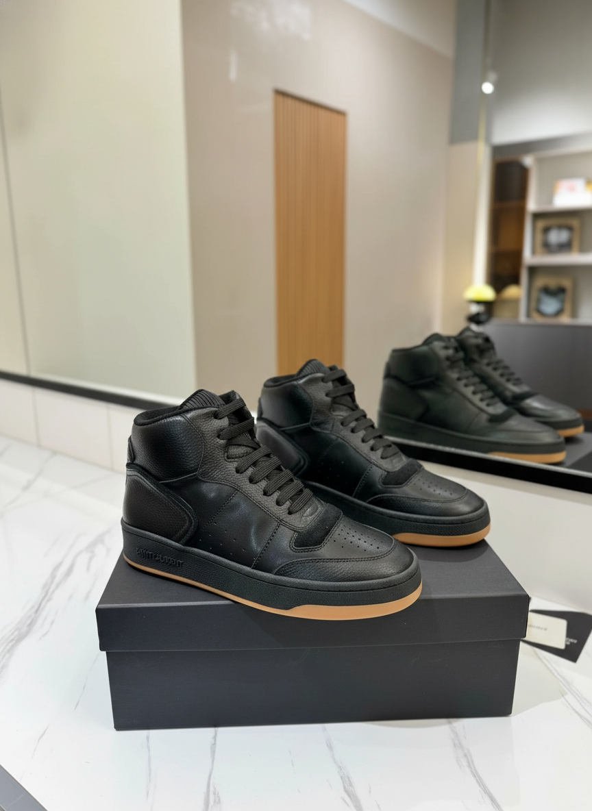 Saint Laurent black leather high-top sneakers with gum sole, stylish design, premium comfort and durability, perfect for casual or streetwear fashion.