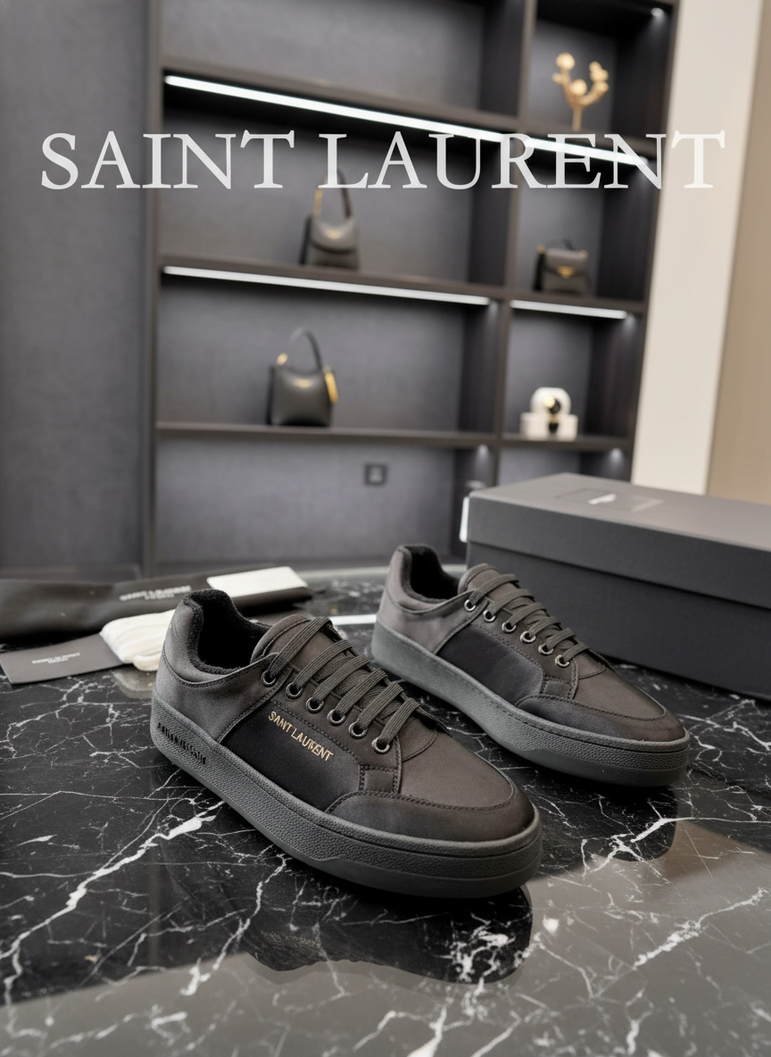 Saint Laurent black low-top sneakers, premium leather and canvas, stylish design, perfect for casual wear, offering comfort and timeless luxury fashion.