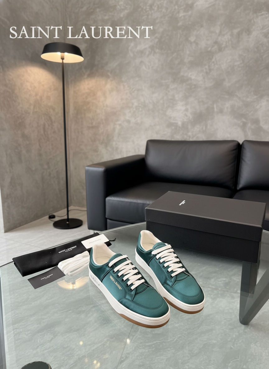 Saint Laurent men’s green leather sneakers with white laces, premium craftsmanship, stylish casual design, perfect for everyday wear and fashion lovers.