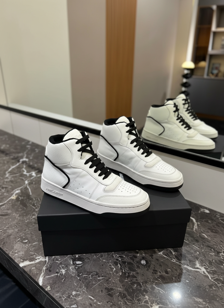 Saint Laurent white high-top sneakers with black laces, premium leather design, stylish and comfortable footwear for men and women.