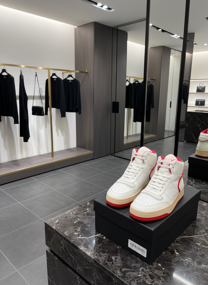 Saint Laurent high-top sneakers in white leather with red accents, classic lace-up design, durable rubber sole, and stylish retro-inspired silhouette for versatile casual wear.