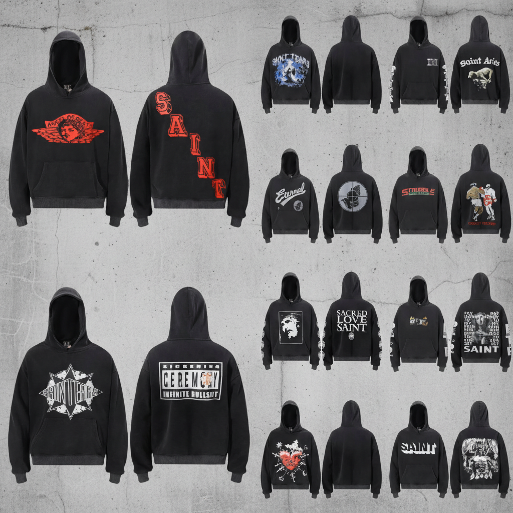 Saint Michael hoodies feature bold graphics, premium cotton, and streetwear style, perfect for casual wear, skateboarding, or layering in all seasons.
