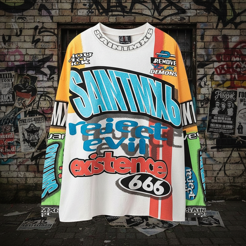 SaintMX6 Graphic Long Sleeve T-Shirt, bold multicolor streetwear design, oversized fit, statement print, perfect for hip hop, skate, and casual urban style.