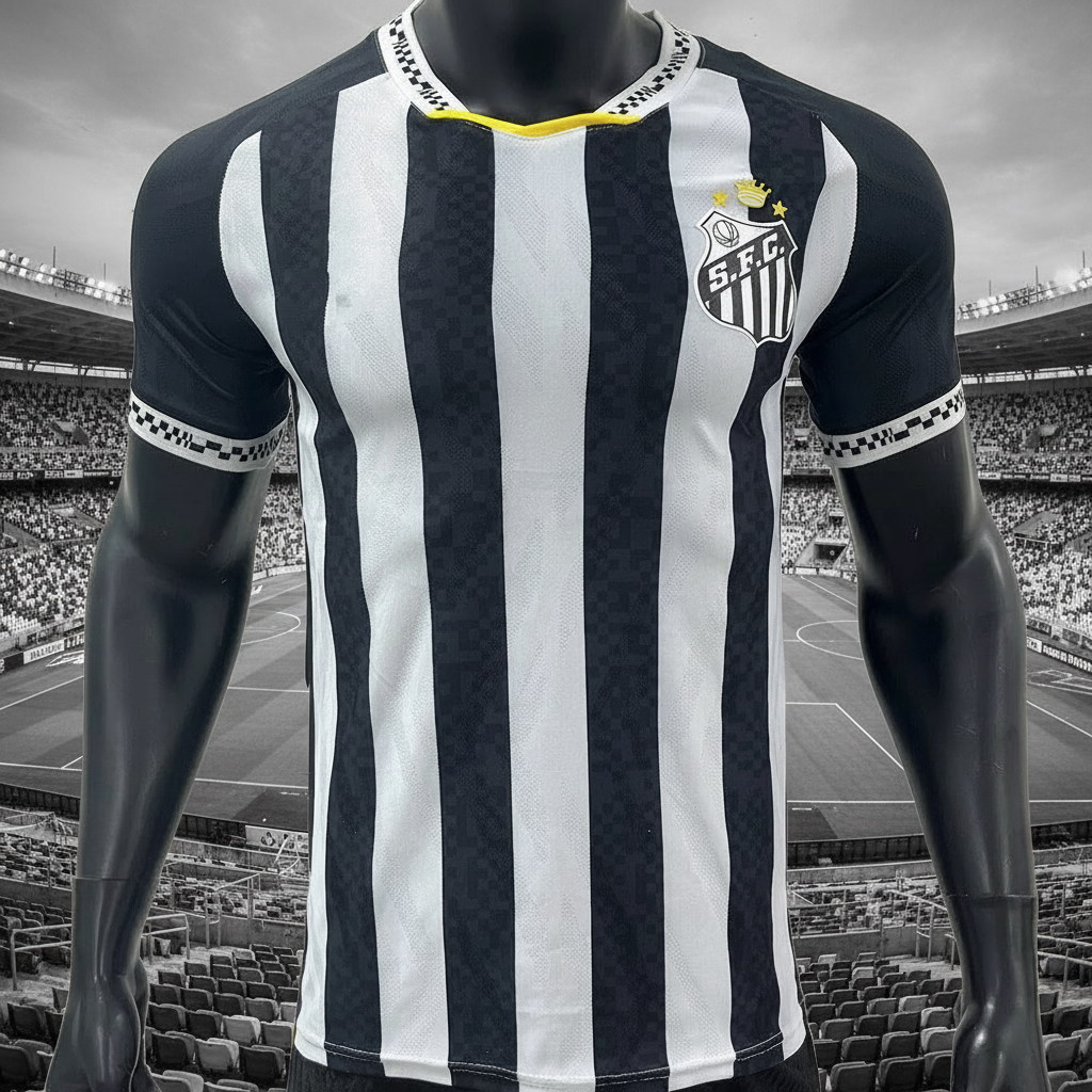 Santos FC black and white striped soccer jersey, breathable fabric, athletic fit, perfect for football fans and sportswear lovers.