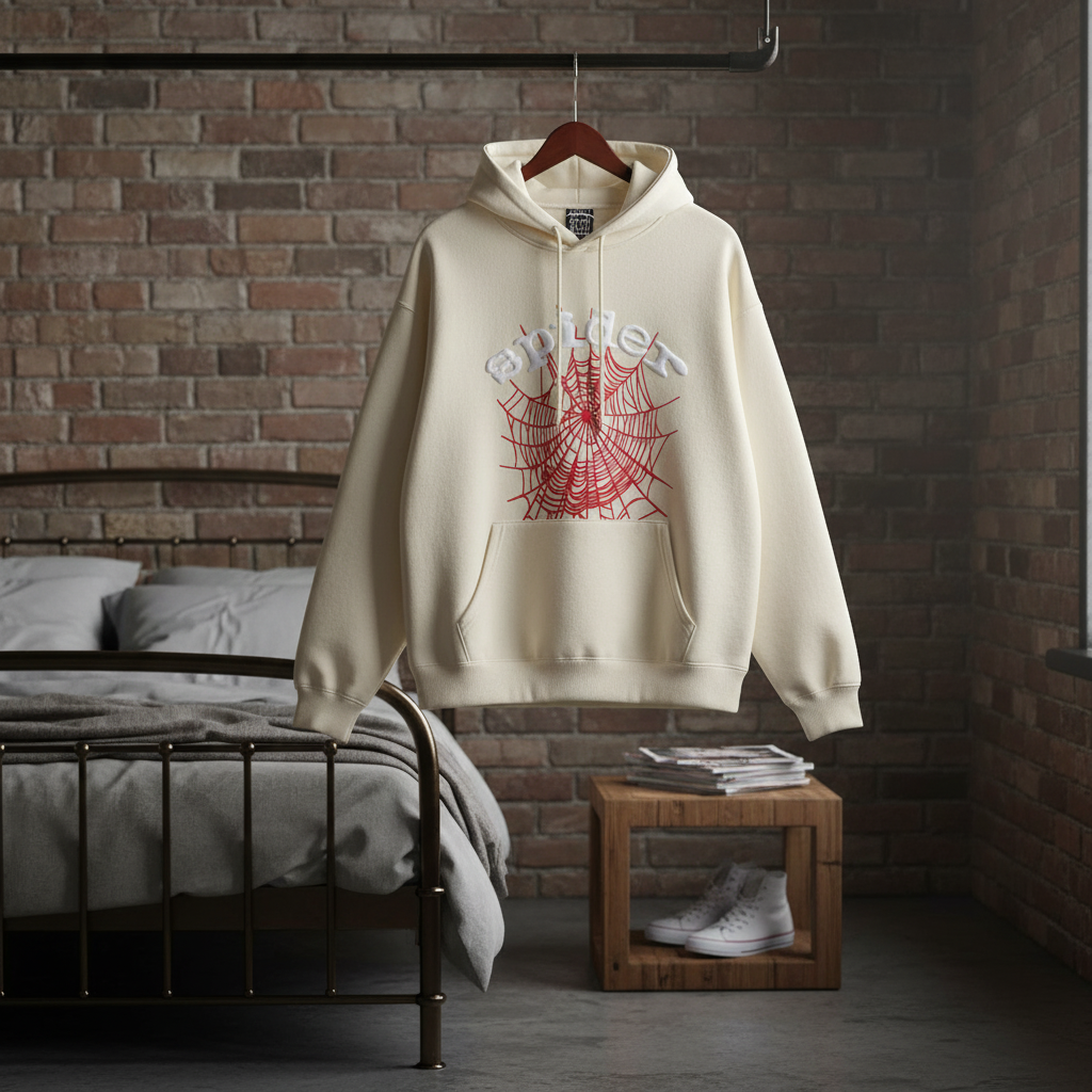 / Sp5der Beige Hoodie & Joggers Set – 3D Spider Web Print