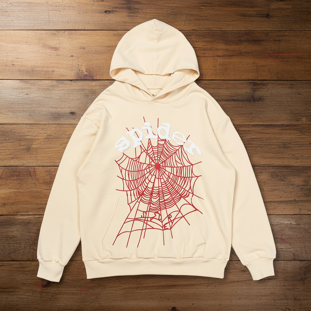 Sp5der Beige Hoodie: Unisex Cotton Streetwear with Spider Web Design