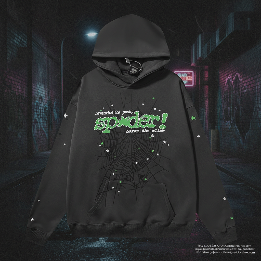Sp5der Hoodie – Black graphic sweatshirt with green logo, web design, star details, streetwear style, soft fabric, ideal for casual wear and fashion lovers.