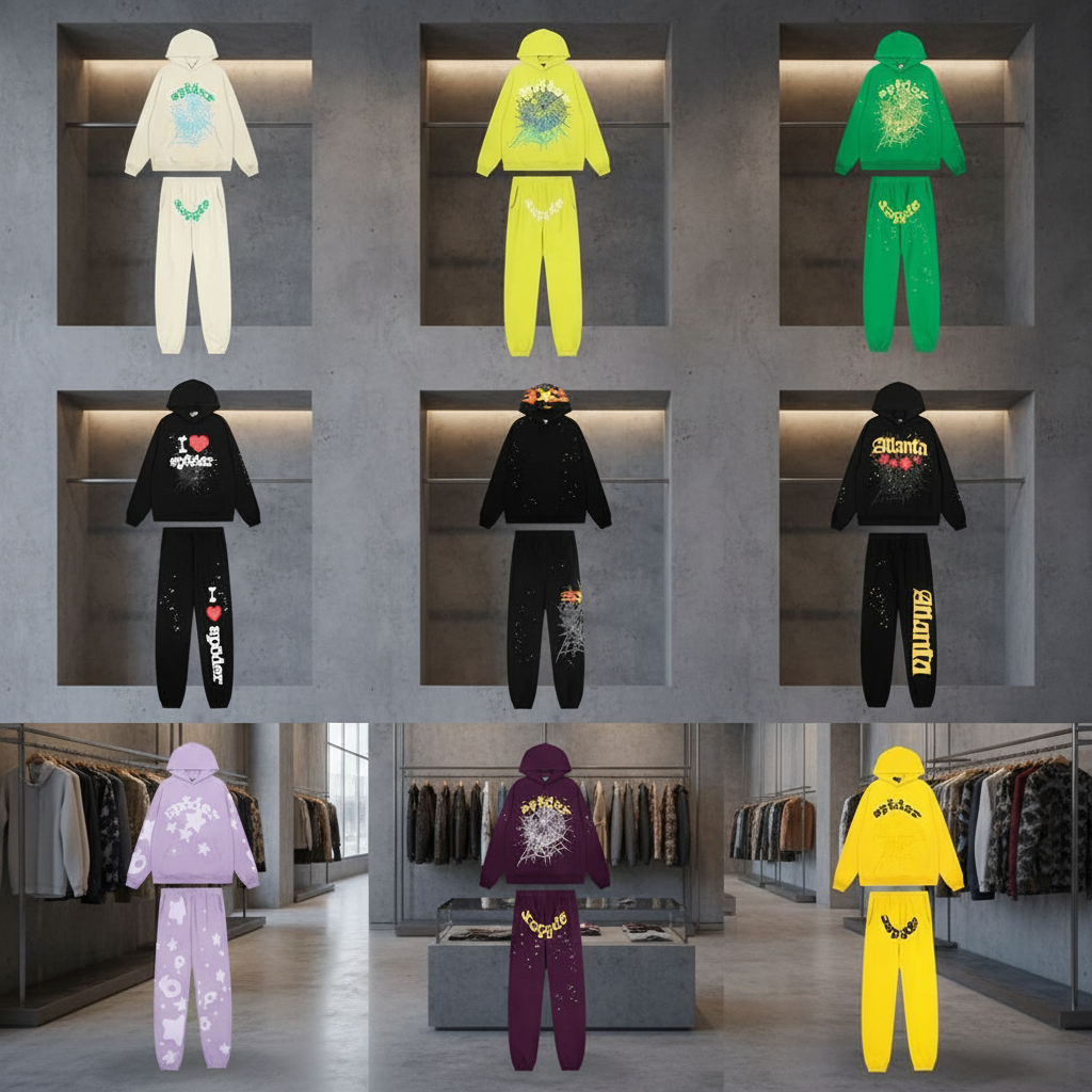 / Sp5der Fluorescent Yellow Spider Web Cotton Hoodie & Joggers Set