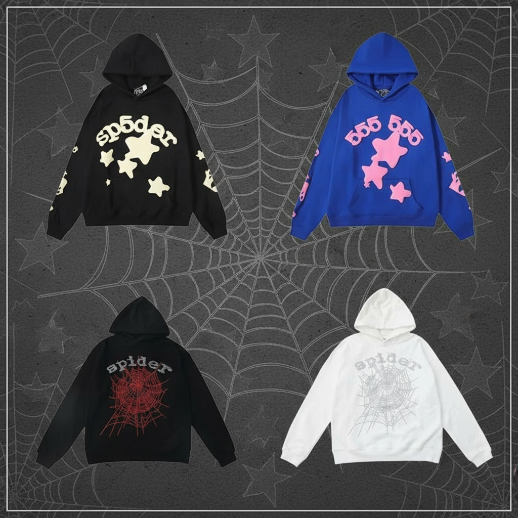 Sp5der hoodies with bold star graphics and spider web design, stylish streetwear for men and women, perfect for casual wear and layering in all seasons.