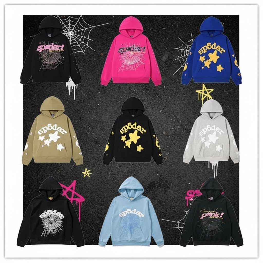Sp5der hoodie collection with graphic prints, spider web and star designs, trendy streetwear style, colorful options for casual and urban fashion lovers.