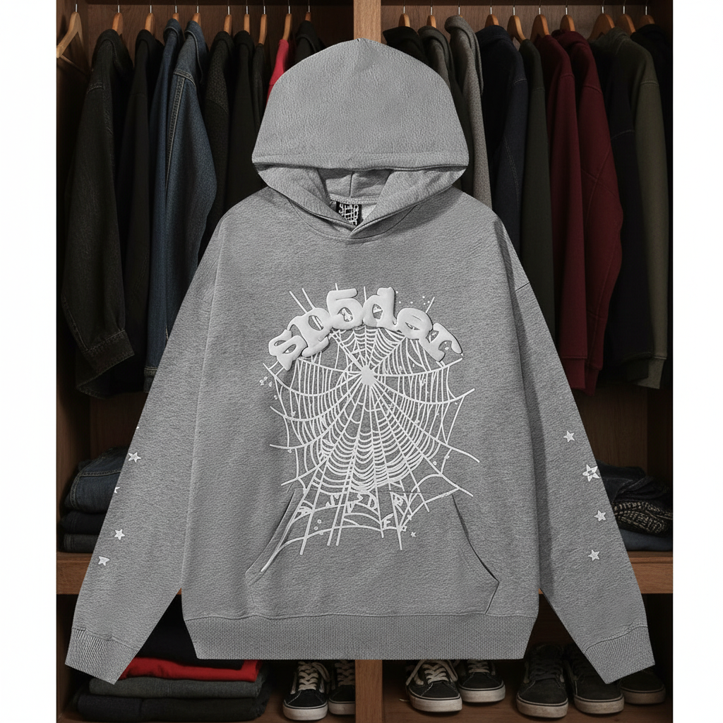/ Sp5der Gray Hoodie & Sweatpants Set, Unisex Streetwear