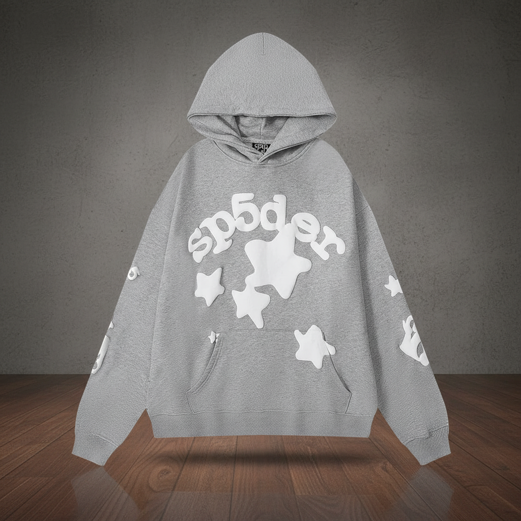 / Sp5der Gray Star Hoodie Set: 3D Foil Graphic, Unisex Streetwear