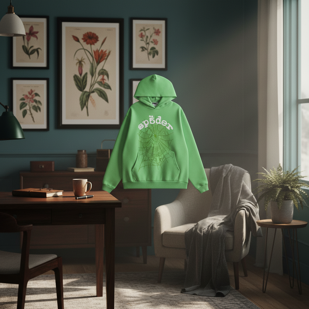 / Sp5der Hoodie Green Cotton Unisex 555 Logo Streetwear