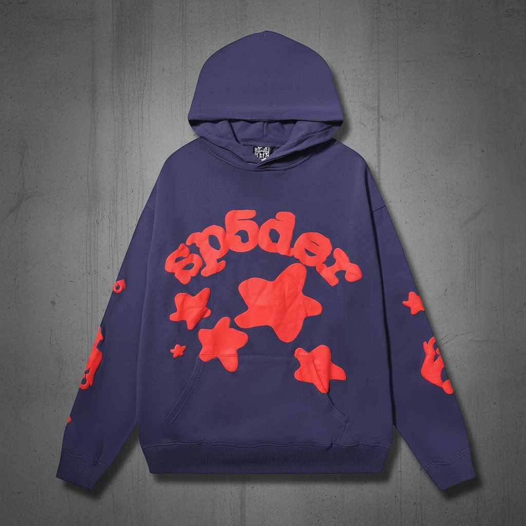 Sp5der Navy Hoodie: 3D Foam Spider & Star Streetwear