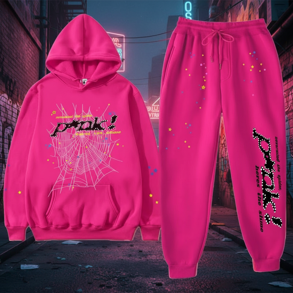 Sp5der Pink Hoodie and Sweatpants Set, stylish streetwear with spider web print, comfy cotton blend, perfect for casual wear and hip hop fashion lovers.