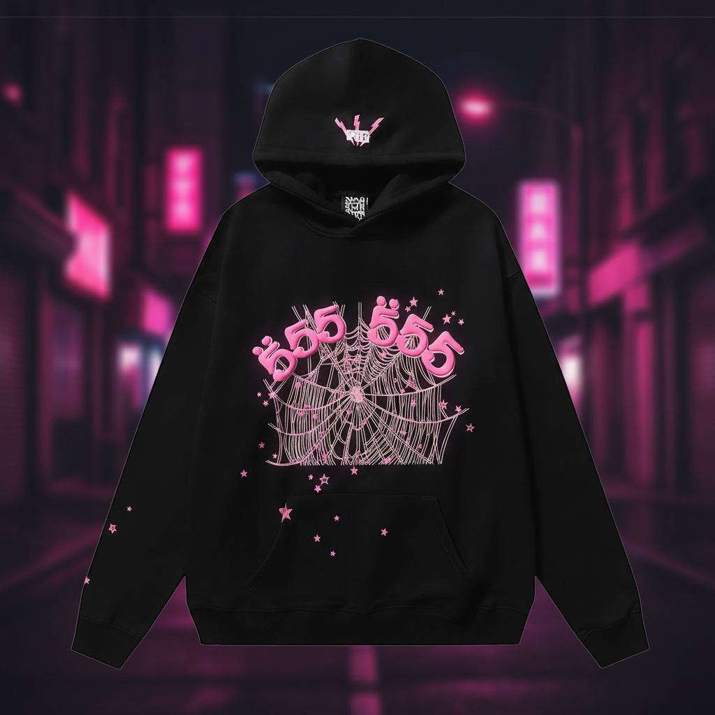Sp5der Hoodie Black Pink 555 Graphic Sweatshirt, Streetwear Pullover with Spider Web and Star Print, Casual Hip Hop Style for Men and Women