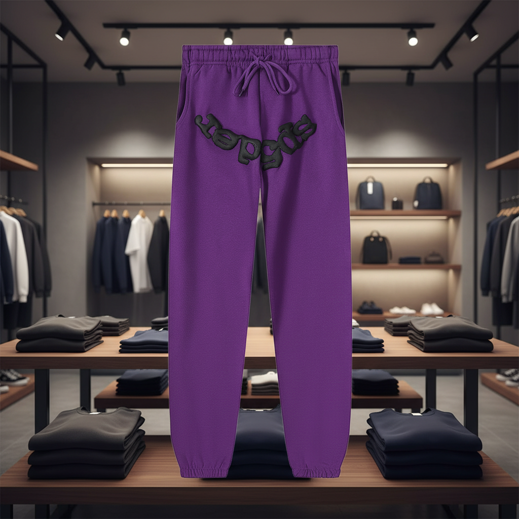 Sp5der Purple Tracksuit Pants: Unisex Hip-Hop Style with 3D Web Print