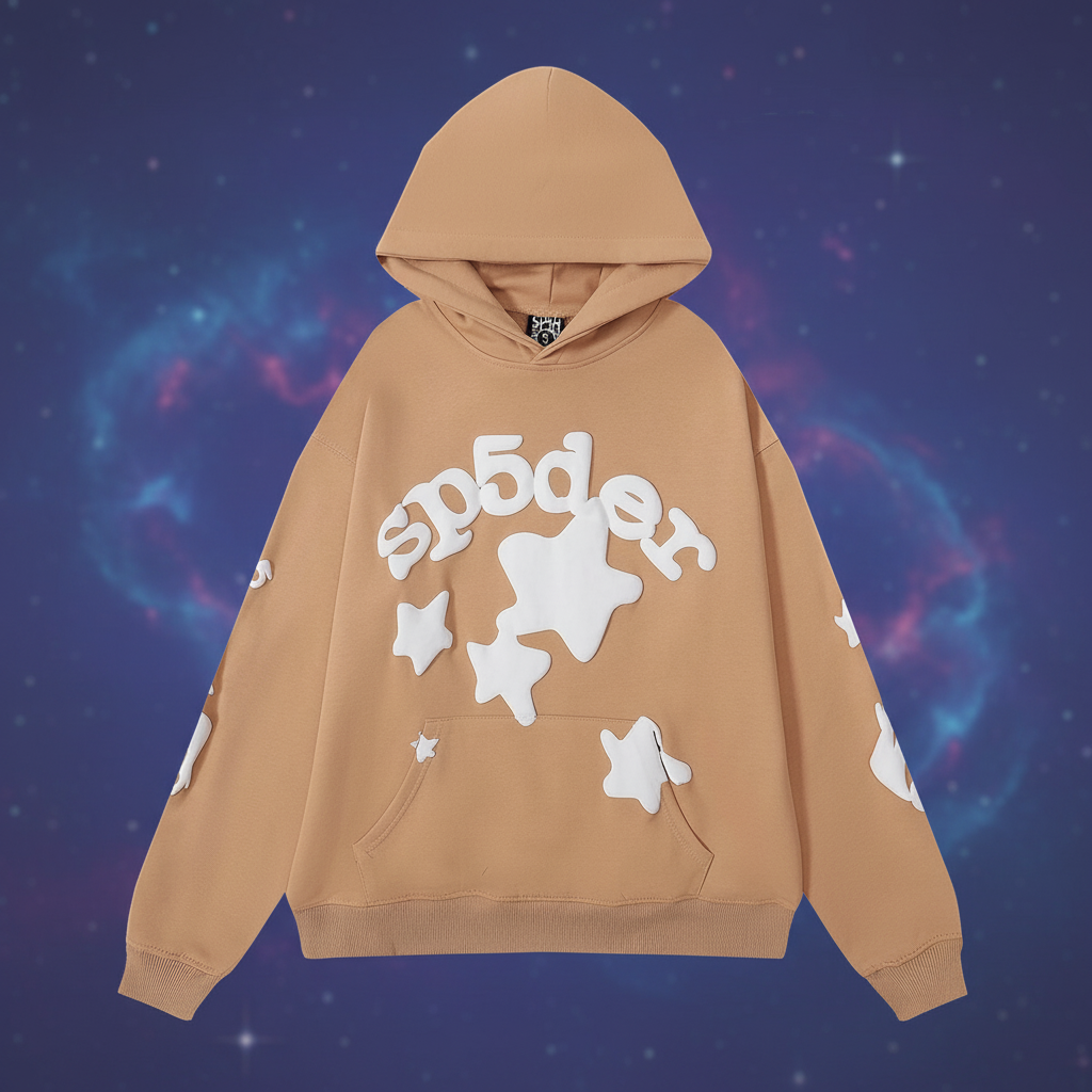 Sp5der hoodie with star appliqué, casual oversized fit, soft beige cotton, streetwear style for men and women, perfect for autumn and winter fashion.