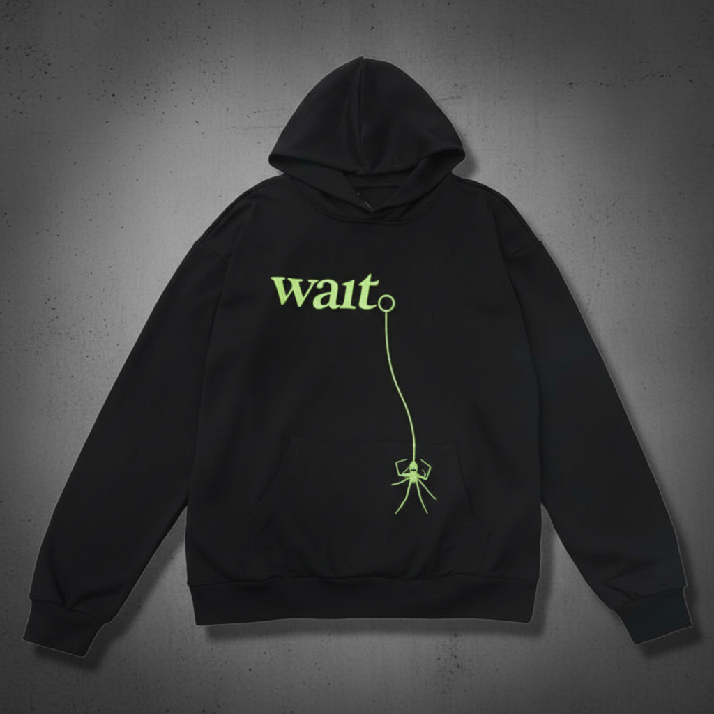 Sp5der Hoodie Black Wait Print, Stylish Streetwear Pullover with Green Spider Graphic, Casual Unisex Fashion Jumper for Autumn Winter
