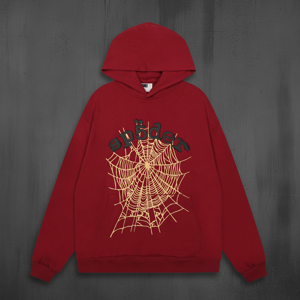 / Sp5der Wine Red Hoodie: Unisex Cotton Fleece Pullover with Web Print