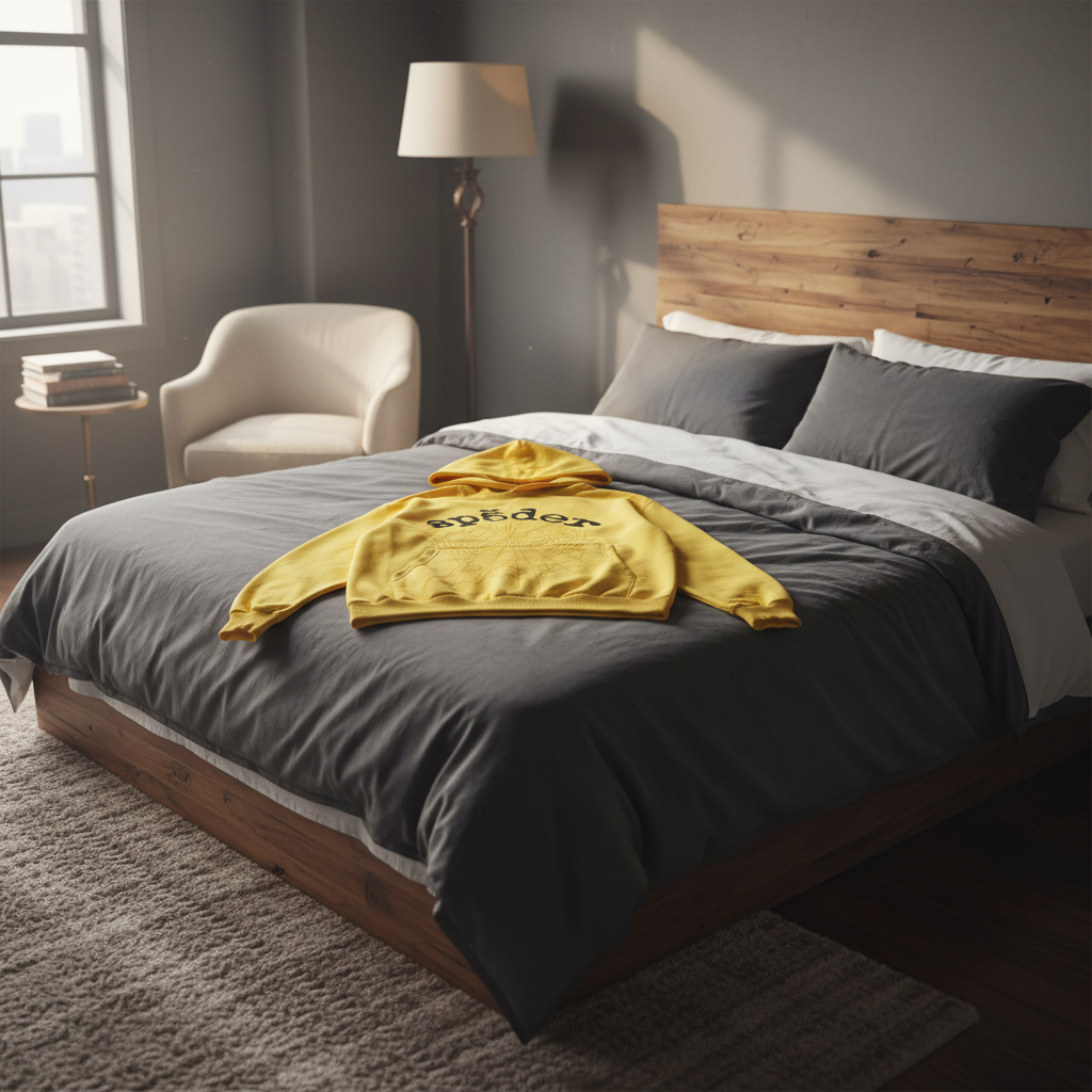 Sp5der Yellow Hoodie, Unisex Fleece Pullover with Spiderweb Design